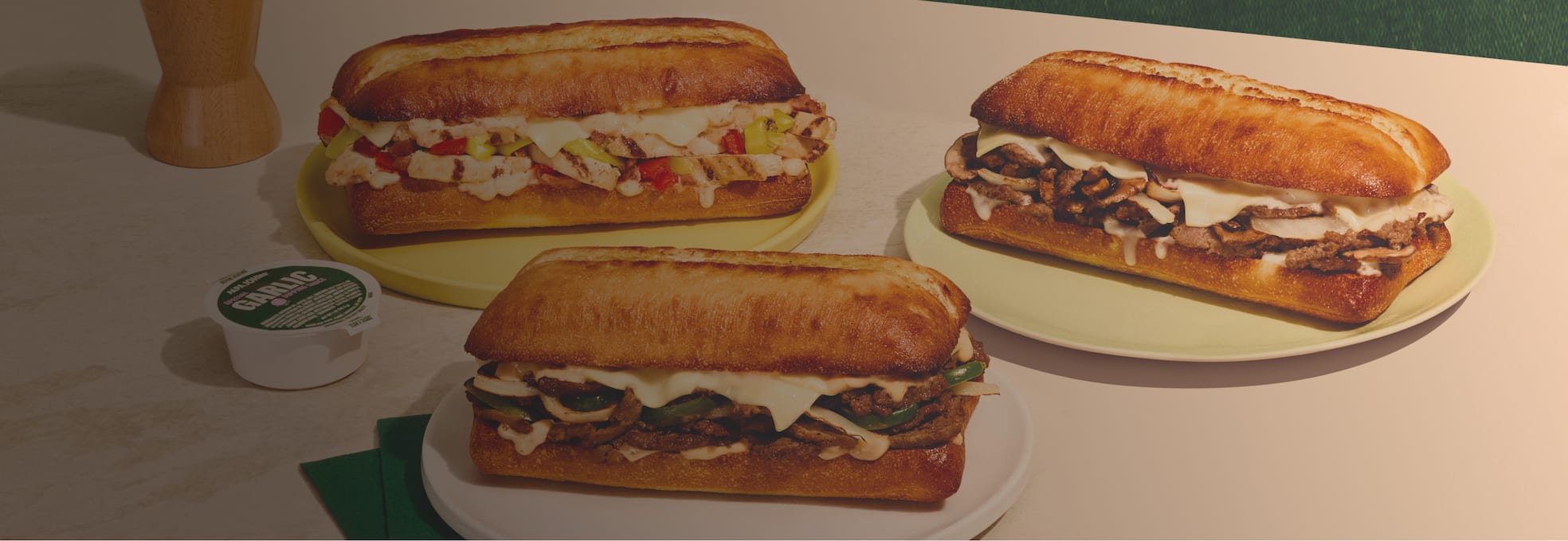 Philly Cheesesteak, Chicken Bacon Ranch, and Steak & Mushroom chef-crafted oven-toasted sandwiches filled